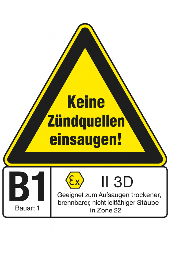 Diese Industriesauger wurden nach -Bauart 1 (B1)/ Zündquellenfreie Bauart- geprüft und sind geeignet zum Aufsaugen von trockenen, brennbaren Stäuben. Prüfanforderungen für den Staubexplosionsschutz bei Industriesaugern und Entstaubern zum Einsatz in der