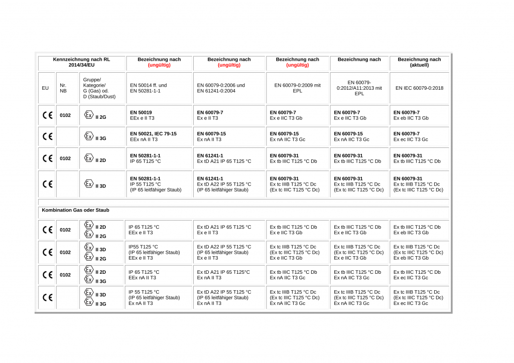 Explosionsschutz-Kennzeichnung gemäß der Richtlinie 2014/34/EU und der EN 60079-0:2018 zzgl. der jeweils zutreffenden Zündschutzartnormen