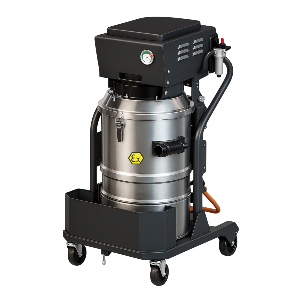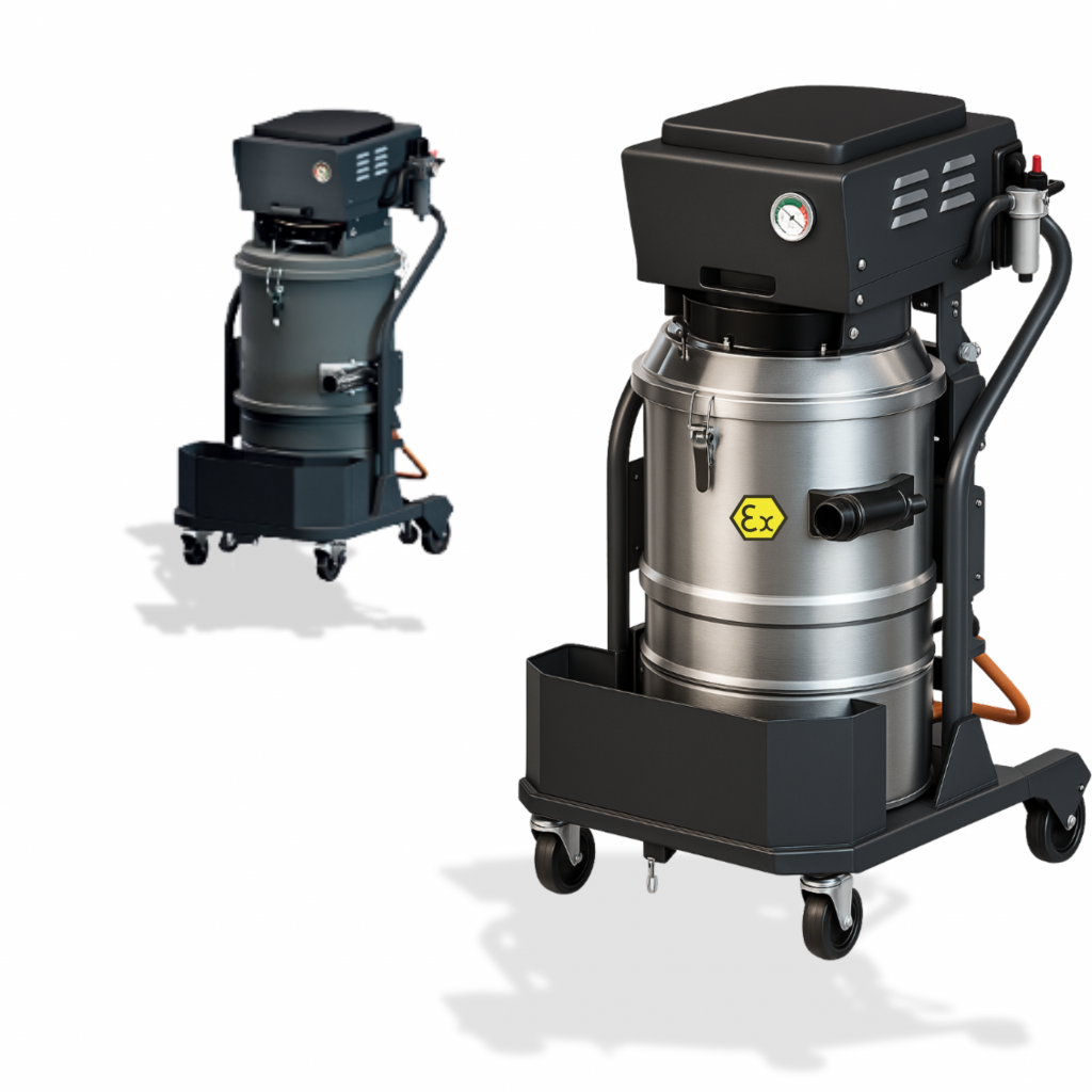 Einsatzbereich: ATEX zertifizierter Sauger für Zone 20/22. Druckluftbetriebener Industriestaubsauger für Staub und Flüssigkeiten. Geeignet für den Dauerbetrieb (24/7) ohne Wartung ideal für den intensiven Einsatz in explosionsgefährdeten Bereichen.