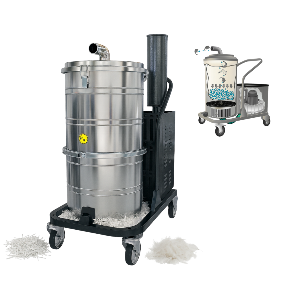 Das Modell TEX ist ein ein oder dreiphasiger Turbinenstaubsauger oder Drehstromsauger, der sich besonders für das Aufsaugen von Materialien mit geringer Dichte wie Holz, Kunststoffreste, Papier oder Textilien eignet. Ausgestattet mit einer wartungsarmen Seitenkanalverdichter