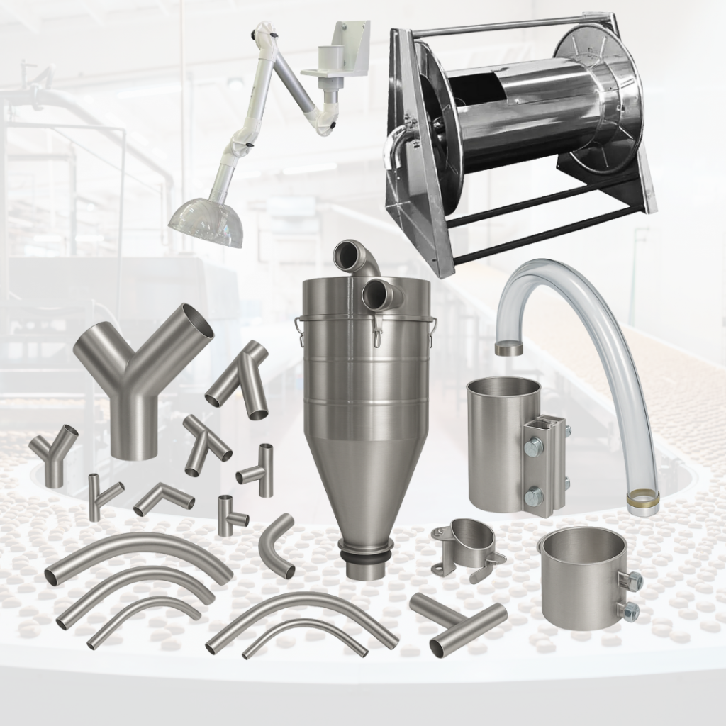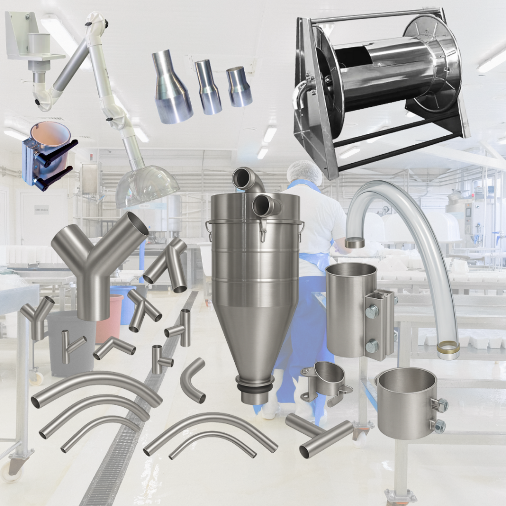 Die eingesetzten Rohrsysteme müssen den Unterdruck sowie den abrasiven Materialfluss dauerhaft aushalten. Aus diesem Grund kommen besonders widerstandsfähige Materialien wie hochlegierter Edelstahl zum Einsatz. Dies gilt insbesondere für stark beanspruchte Komponenten wie: